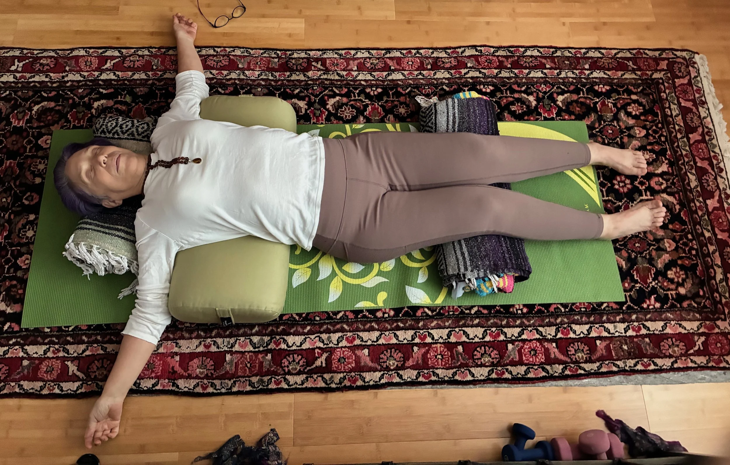 Before you arrive and throughout our time together, consider how you are best served. Should you be on or off camera; stand up, lay down or be in some other position; or have something soothing to drink on hand? Gather blankets, cushions, or other supports you may want to call upon during our time together, including writing or drawing implements and media, markers, crayons, or paints to set out your reflections on what you are experiencing if do that that serves you. My favorite position to receive guided meditation in is a restorative yoga pose called Mountain Brook (see image above) and I invite you to explore and use the posture(s) that best support you. Please know that you are welcome to leave the offering early or leave and come back. All DJATD sessions will be recorded so you can experience or re-experience them later.
